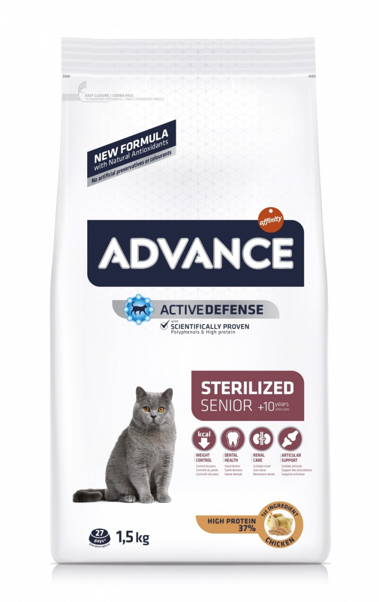 La reputazione del marchio ADVANCE è ben consolidata! Questa vasta gamma di mangimi per gatti ti permetterà di indirizzare e soddisfare esattamente le esigenze del tuo animale domestico. Che sia per un gatto sano o affetto da una patologia specifica, Advance ti offre una soluzione adeguata e completa. Le crocchette per Gatti Senior Sterilizzati Senior Advance Sterilized + 10 con pollo sono raccomandate per gatti di tutte le età di età superiore ai 10 anni. Aiutano a prevenire l’obesità attraverso una ridotta assunzione di energia metabolica. Hanno anche un alto livello di fibra per favorire la sazietà e un rapporto proteine ??/ grasso ideale per mantenere la massa muscolare.
