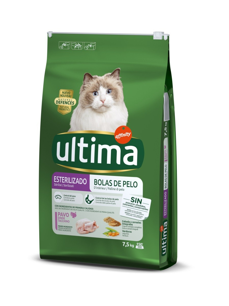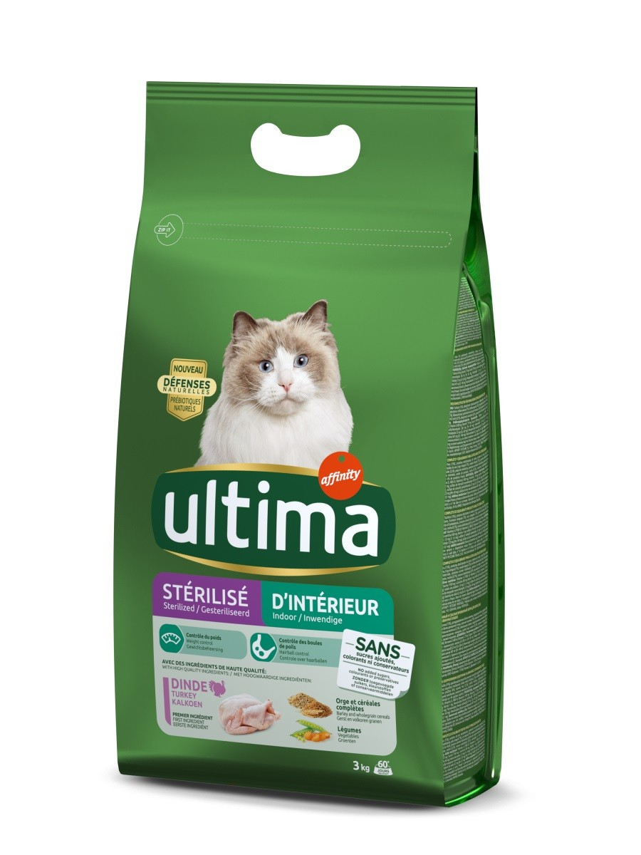 Ultima Indoor Sterilizzato è una ricetta adattata alle esigenze dei gatti sterilizzati da interno, che sono inclini alla formazione di palle di pelo. Il suo alto contenuto di fibre aiuta a ridurre la formazione di palline di capelli favorendo l’escrezione dei capelli attraverso il tratto digestivo. Questa ricetta contiene anche un moderato livello di grassi e calorie che, combinato con il suo alto contenuto di fibre e L-carnitina, aiuta a controllare il loro peso.