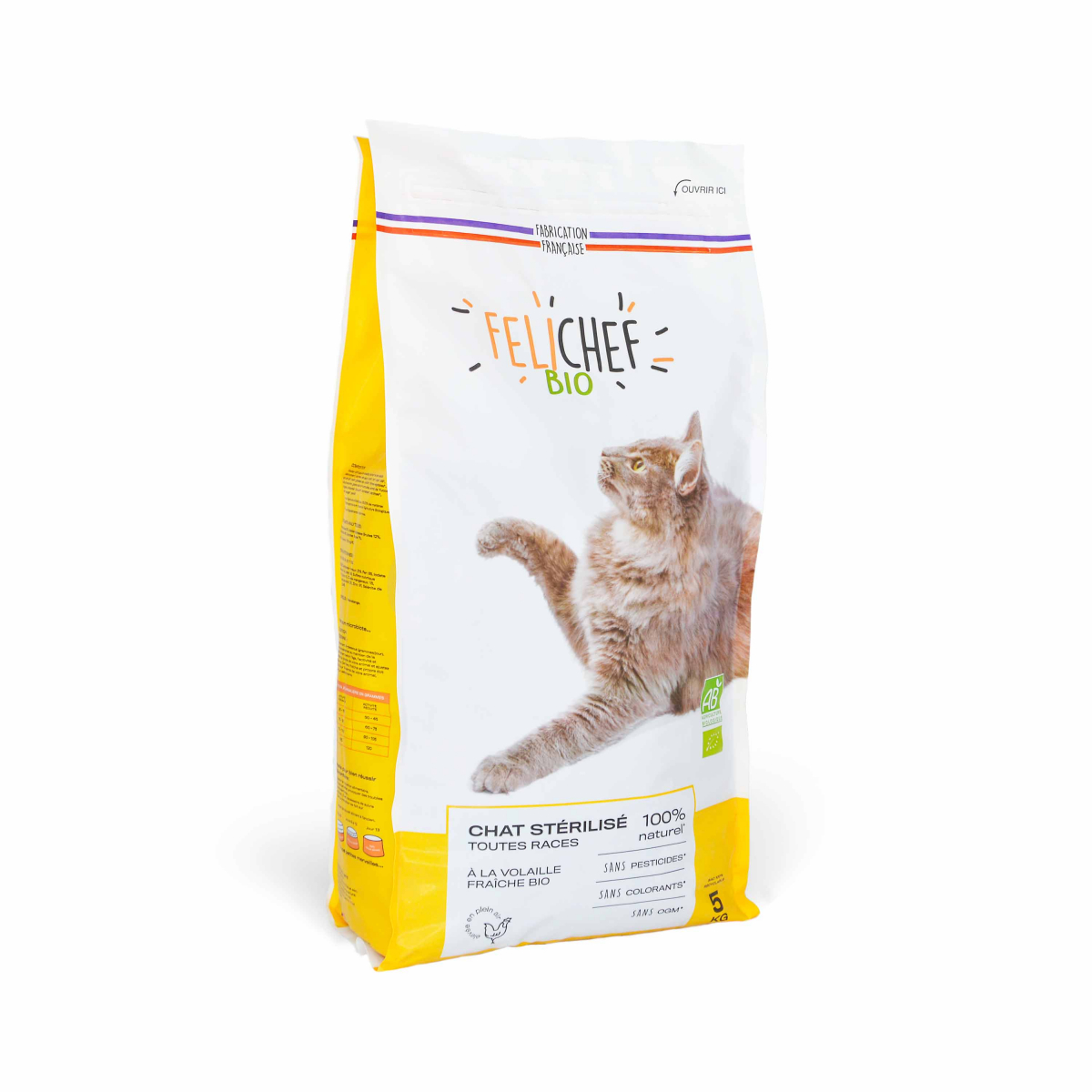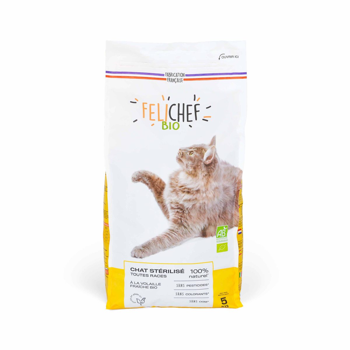 Le crocchette FELICHEF ORGANIC per gatti adulti sterilizzati sono un alimento completo e bilanciato che risponde alle esigenze specifiche dei gatti adulti sterilizzati di tutte le razze, a partire da un anno di età. Il contenuto energetico moderato di queste crocchette evita l’eccesso di peso che i gatti sterilizzati possono naturalmente guadagnare. Senza OGM, coloranti o conservanti, queste crocchette biologiche per gatti sterilizzati forniranno al vostro compagno tutti i nutrienti essenziali per una buona salute. Questi alimenti per gatti FELICHEF sono certificati AB BIO dall’organizzazione Ecocert e sono prodotti al 100% in Francia (a Mayenne). Anche gli ingredienti sono francesi al 100%.