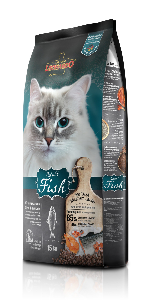 Le crocchette per gatti adulti Leonardo Adult Fish con Pesce hanno un gusto particolarmente saporito con oltre il 30% di salmone fresco adatto a tutti i gatti (anche quelli con il pelo lungo).
