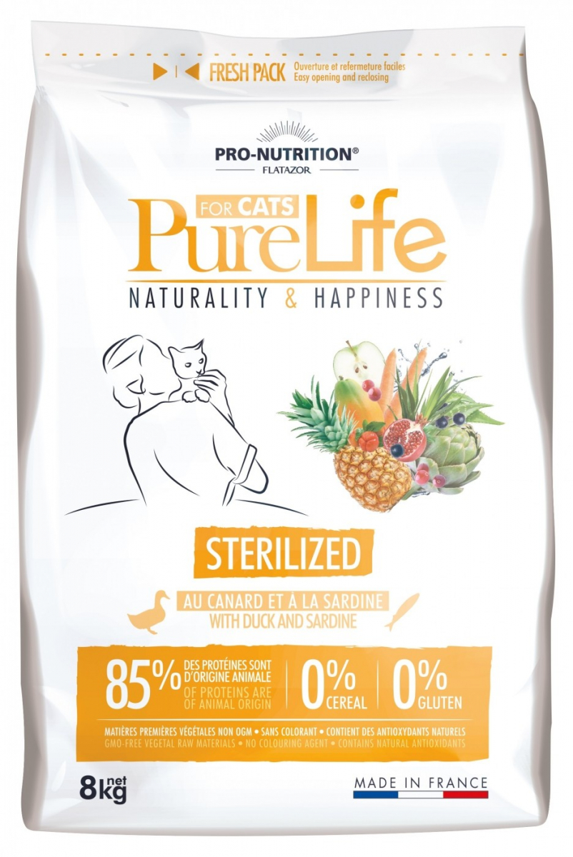 Le crocchette senza cereali per gatti sterilizzati PRO-NUTRITION Flazator Pure Life Sterilized sono consigliate per gatti adulti di tutte le razze sterilizzati, a partire da circa un anno. Il buon gusto di anatra e sardina, favoriscono il comfort urinario (molto spesso indebolito dopo la sterilizzazione) grazie alla presenza di mirtillo e un ottimo equilibrio in minerali. Un’assunzione moderata di calorie consentirà il controllo del peso del tuo gatto per evitare eccessi. Ricche di fibre, promuovono anche la sazietà per evitare la frustrazione. Infine, queste crocchette assicurano il benessere digestivo grazie alla presenza di frutti e un contenuto di fibre adatto a limitare i boli di pelo.