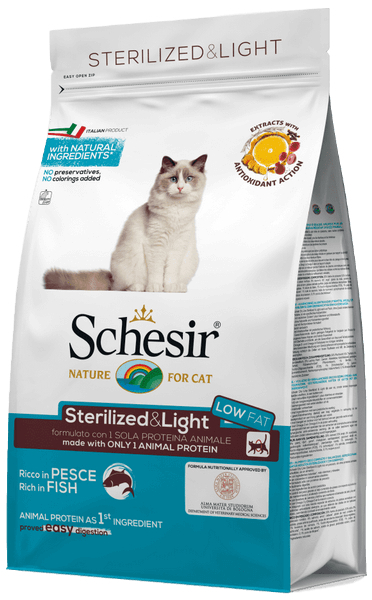 Le crocchette SCHESIR Sterilized Light per gatti adulti sterilizzati con pesce sono un alimento secco per gatti sterilizzati o in sovrappeso. È un alimento completo per gatti adulti. Formulato con un’unica fonte di proteine animali (pesce), che è anche l’ingrediente principale, è un alimento gustoso, completo, equilibrato e facilmente digeribile che soddisfa le esigenze nutrizionali dei gatti adulti sterilizzati di tutte le razze.